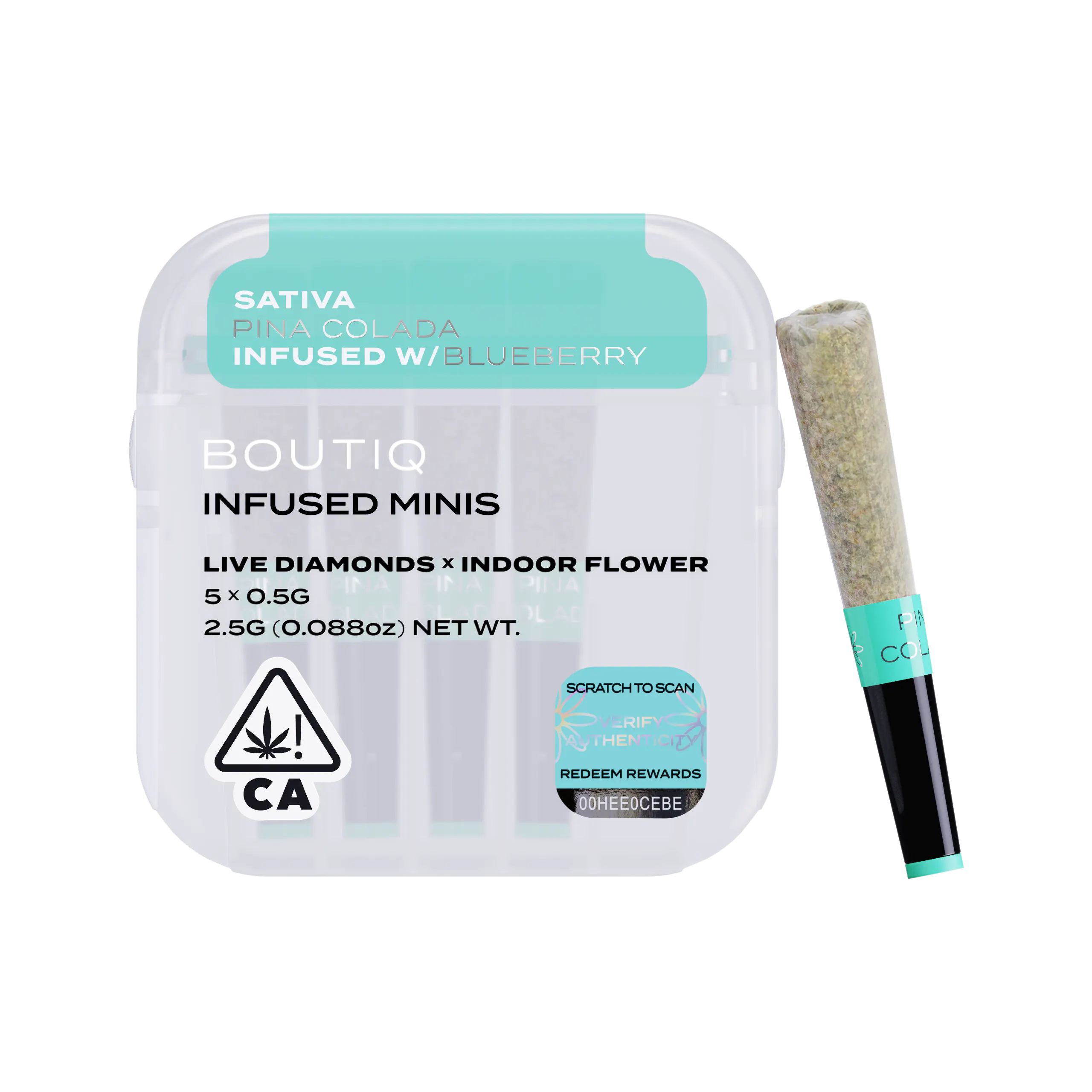2.5G New BOUTIQ Prerolls. These 5 mini prerolls of 0.5g each are crafted with Premium indoor-grown flower, and infused with Live Diamonds. The ceramic tip allows for a perfect draw and cleaner taste. Now featuring a new airtight and waterproof case for ultimate convenience.