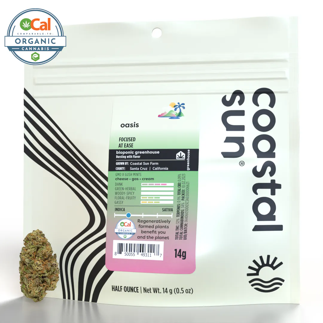 Oasis is an aromatically creamy cultivar with soft hints of cheese that open up into a lightly gassy and floral perfume scent. It’s a cross between the notoriously pungent GMO and the funky Gush Mints – flavors that amplify when smoked. The effects tend to hit heavy in the body and leave you with red eyes. It’s an addition to your smoke sesh may help to relieve tension leaving you feeling optimistic and focused.