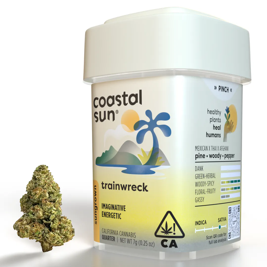 Trainwreck’s history dates back to the 1970s in Northern California when two brothers bred it. Its genetic lineage of Mexican, Thai, and Afghani creates piney, spicy, and peppery aromas with flavors of citrus and cheese. Legend tells two tales about its name. The first is that it was cultivated near the site of a major train crash, while the other alludes to its powerful, freight train-like effect on users. This invigorating experience may be suitable for moments requiring creativity and energy.